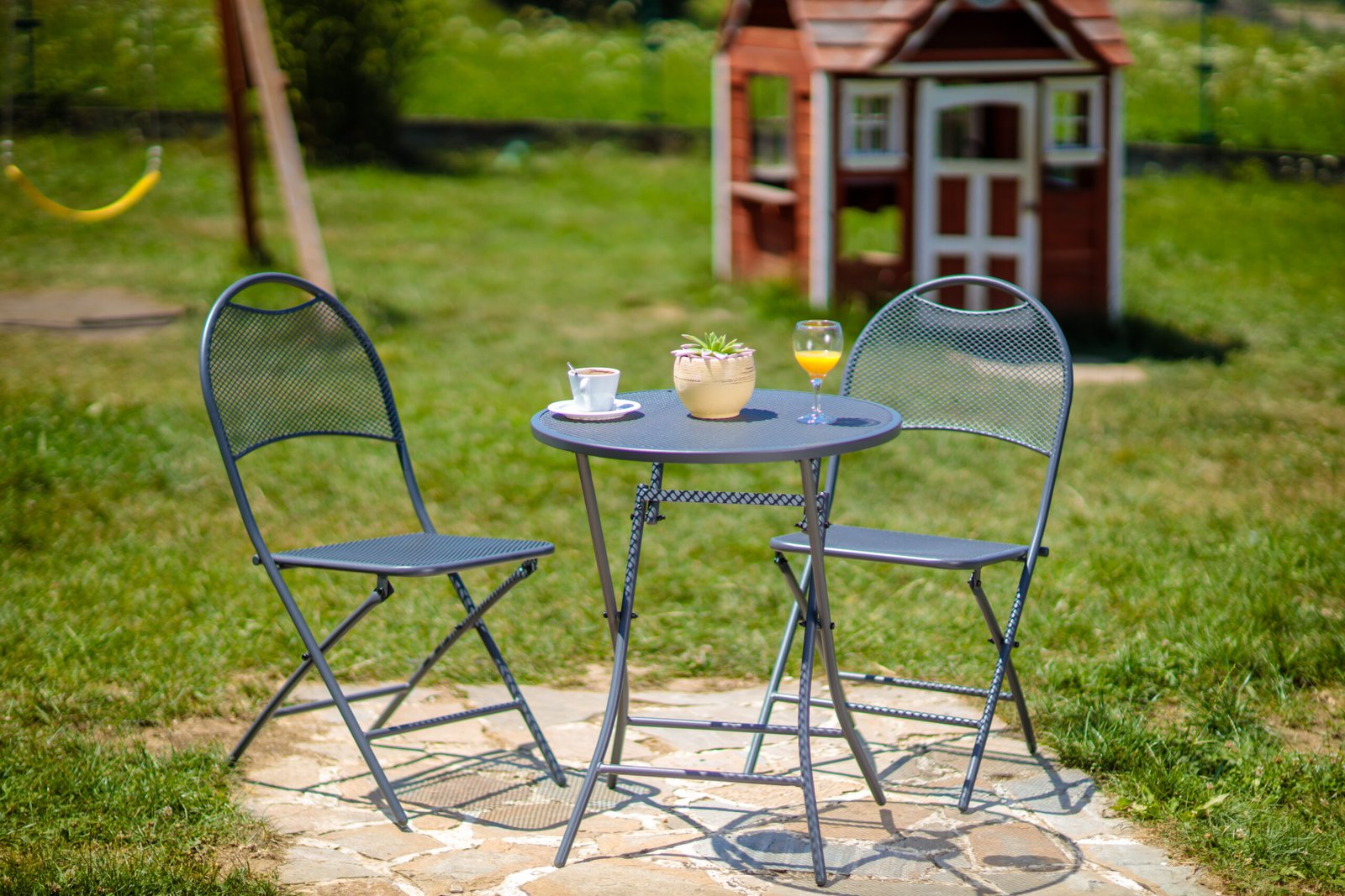 Fiecare scaun are dimensiunile de 54,5×45,5×89 cm, oferind un loc confortabil pentru două persoane. Masa are dimensiunile de 60×72 cm, fiind ideală pentru mese intime în aer liber. Acest set de mobilier este perfect pentru a crea un colț confortabil în aer liber, unde să vă bucurați de mese și momente de relaxare în compania celor dragi.
