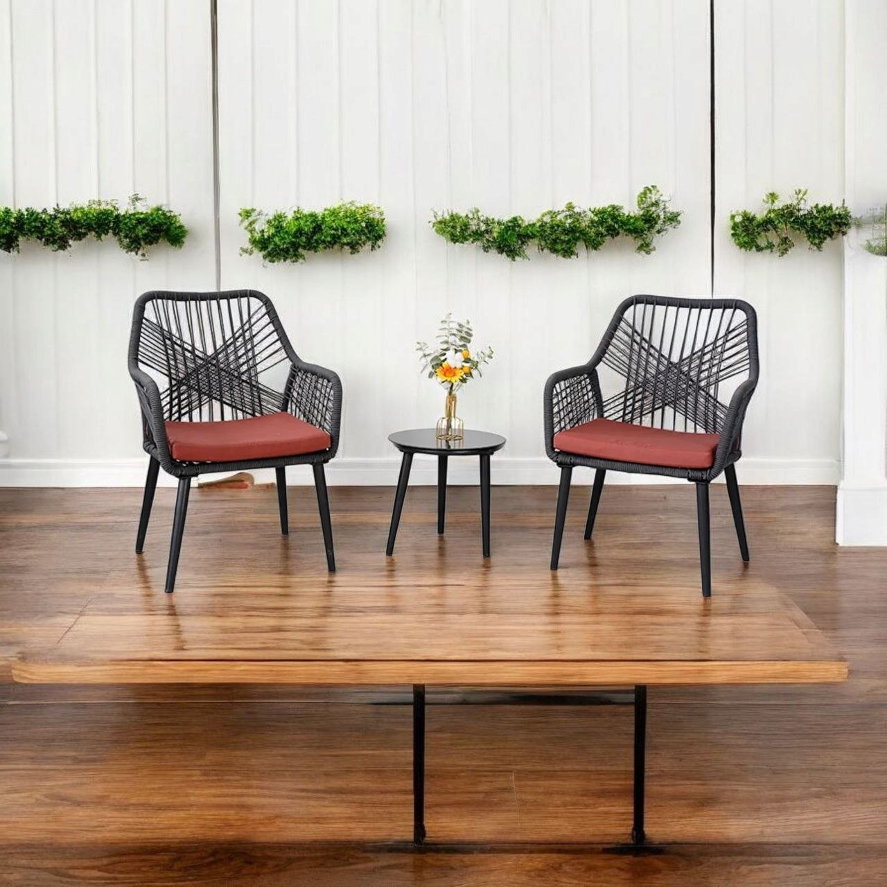 Setul de scaune și masă din frânghie împletită constă din trei piese, fiind ideal pentru a crea un colț confortabil pe terasa sau în grădina dumneavoastră. Scaunele au dimensiuni de 61x71x91 cm, oferind confort și spațiu generos pentru ședere. Masa are un diametru de 45 cm și o înălțime de 46 cm, ceea ce o face convenabilă pentru așezarea băuturilor și gustărilor. Frânghia împletită cu diametrul de 6 mm conferă setului un aspect elegant și modern, asigurând totodată durabilitate și rezistență.